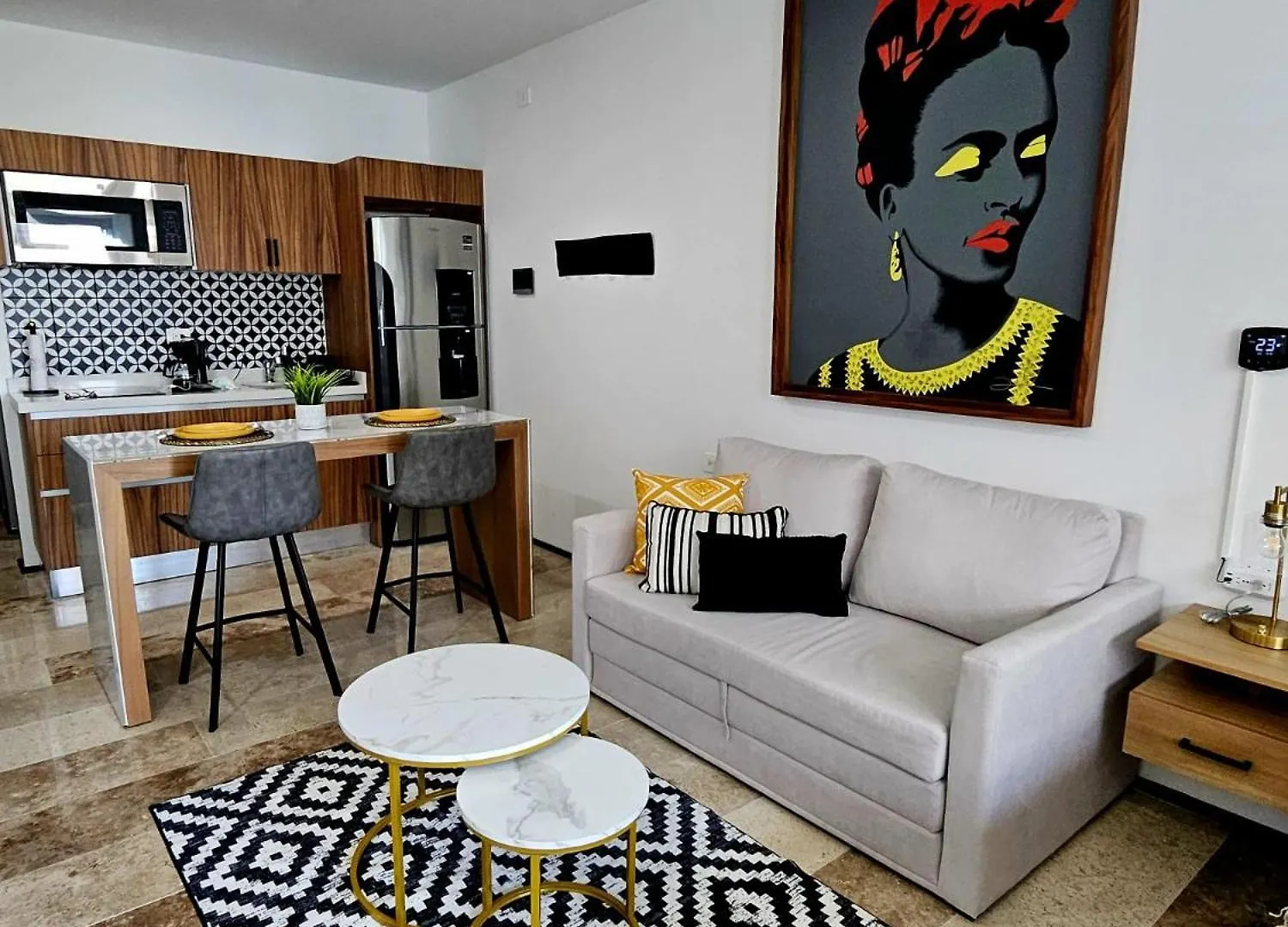 The 48 ft² apartment is nestled in the 5th Avenue district, a mere 6 minutes' stroll from Coco Bongo. The city center is just 0.6 miles away and Playa Del Carmen, Quintana Roo airport is 700 feet from Stylish Condo With Roof Top Ocean Views Near Mamitas Beach And 5Th Ave. The property also lies 1.8 miles from the Scenic Point Esmeralda White-Sand Beach.